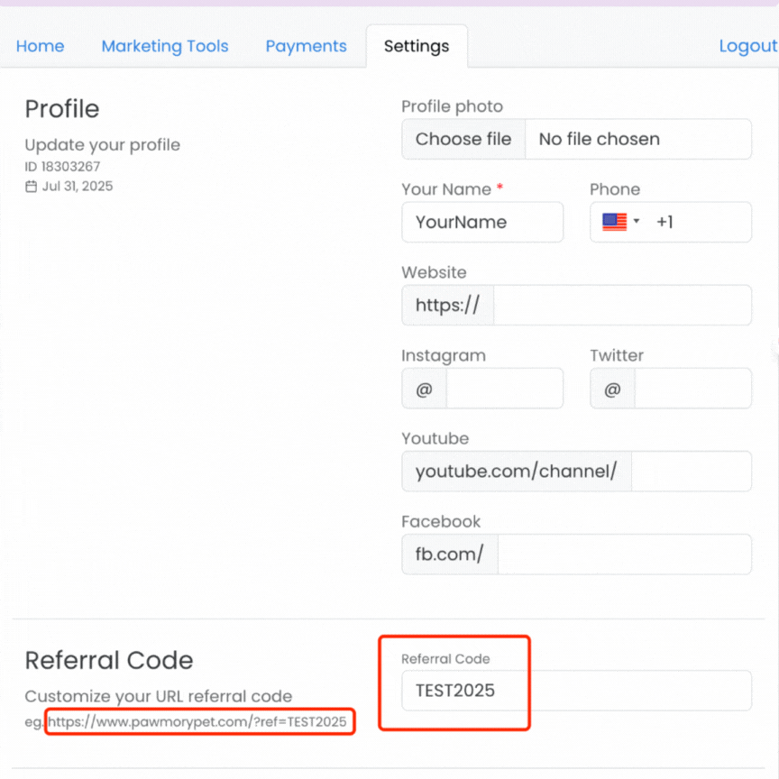 - Once customized, copy your unique referral link and share it on your social media platforms or other channels.